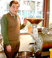 「きゃらばん」マスター(焙煎機の前にて)